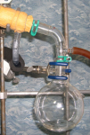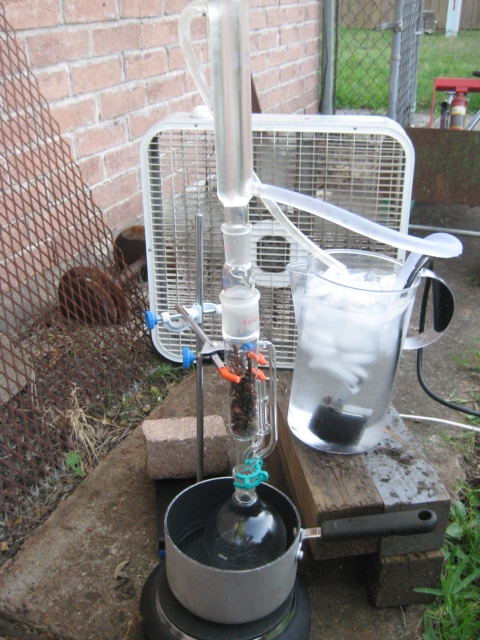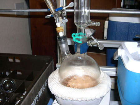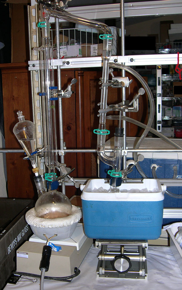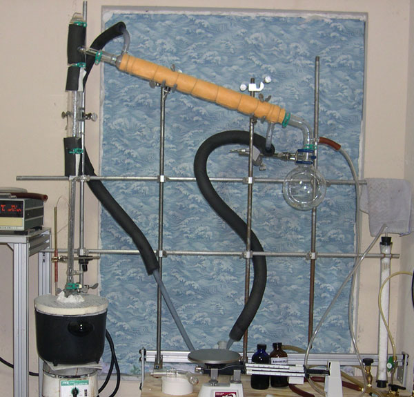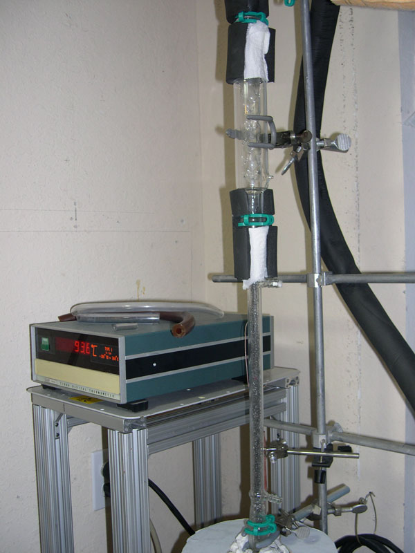 His setup is really cool so I thought I'd take a couple of pics. He's got a long column filled with steel wool attached to a vigreux then a long condenser and it's a very sloooooowww drip drip of stuff coming out, so we'll be up most of the night although he's calculating how much mol sieve he'd need - that stuff don't work too well. Has a tendency to contaminate with some kind of dust. Also got a shot of the power controller he's using to - it's got more pieces and parts to it that he pulled from various ebay finds. It's a eurotherm and he's pretty happy with it.