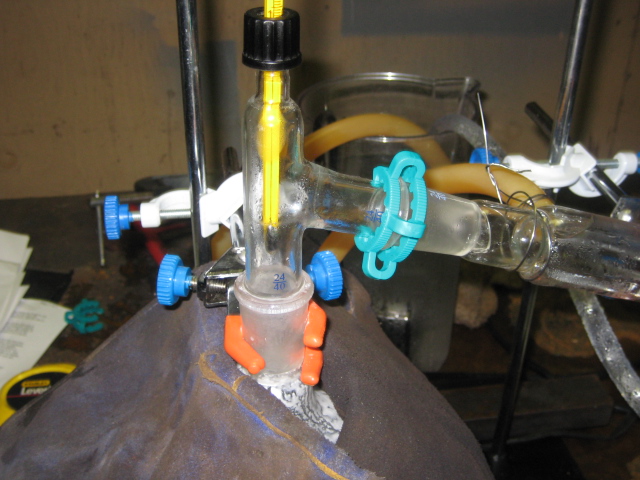 Flask was put back in ice water bath and the set up was changed to allow a simple distillation. Temperature started to rise and something came over at 41 *C Temp went up to 50* C than back down to 42* C WTF! Referred back to distillation notes and adjusted the thermometer bulb to sit a tad lower than bottom of the side arm and waited for condensate to appear on bulb. Still had issues on temperature not rising fast enough so I wrapped three welding gloves around the still pot and head. Eureka the temp went up to 61* C, fairly quickly! The temperature was actually controlled by removing a welding glove or two than putting them back to keep at 61*C.