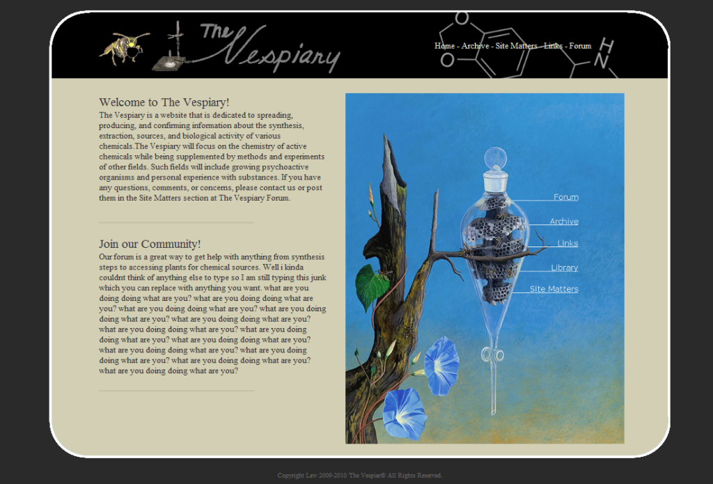 I am a heavy software programmer, and i got a good knowledge on web based coding although its not my favorite category of programming. I can program a database using SQL, PHP, and similar databases. I would like to also know the design The Vespiary is going for as far as site function. Would you like to possibly move the experiences and such to a more Site based view rather than the forum, much like on Erowid? I'm here if you need me! I also lead/own an independent game design team, so I could easily use any members from there for Graphics design, more coders, and what not. I am currently taking my 2nd year of a web design course, although I have had much knowledge before the classes.