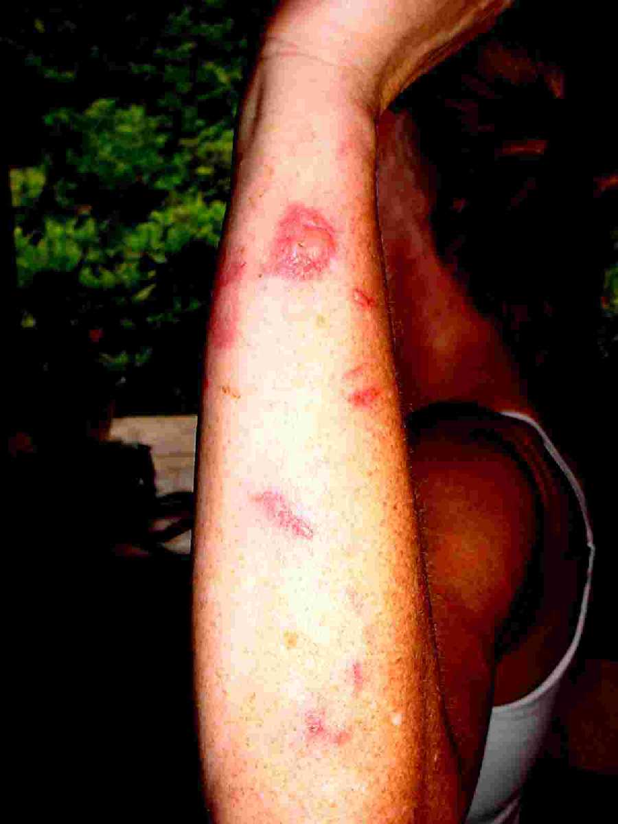 Giant Hogweed is a phototoxic plant. Its sap can cause phytophotodermatitis (severe skin inflammations) when the skin is exposed to sunlight or to UV-rays. Initially the skin colours red and starts itching. Then blisters form as in burns within 48 hours. They form black or purplish scars, which can last several years. Hospitalisation may become necessary.[1] Presence of minute amounts of sap in the eyes, can lead to temporary or even permanent blindness. These reactions are caused by the presence of linear derivatives of furocoumarin in its leaves, roots, stems, flowers, and seeds. These chemicals can get into the nucleus of the epithelial cells, forming a bond with the DNA, causing the cells to die. The brown colour is caused by the production of melanin by furocoumarins. In Germany, where this plant has become a real nuisance, there were about 16,000 victims in 2003.