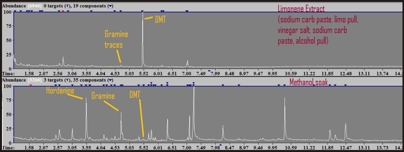 Limonene pulls and vinegar saltings are very selective to DMT and do NOT pull hordenine nor gramine (they do pull gramine but only in trace amounts)