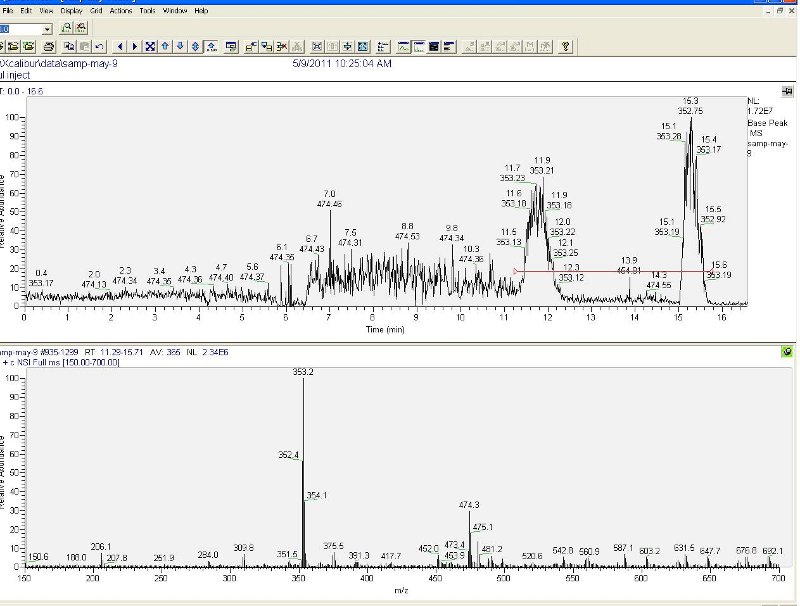 in any event, I ran ESI-MS on an extraction from a new batch (4 days old), and got a strong signal for 353 m/z.