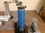 The last item appears to be a vacuum trap, a vacuum pump being attached to one end and a vacuum line to the other, the Dewar is filled with liquid nitrogen or dry ice/acetone slurry. The cold precipitates solvents preventing them from reaching the pump, and the blue mesh protects the user in the event of an implosion.