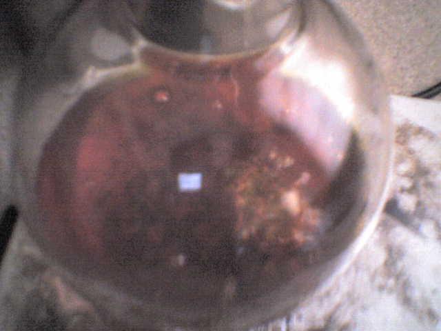 This is then brought to a gentle reflux while magnetically stirred for ~45-60min. The color should progress from a light yellow to an orange, red, and finally a deep red(somewhat black...almost like black cherry kool-aid!). Heat is then removed and allowed to cool down a bit for about 15-30min. until it is no longer boiling but still hot. Watch out for the IPA/nitroalkene vapors! They will make you cry and cough(guess how I learned?)! The still hot mixture is quenched with ~200ml freezing cold 70% IPA to induce crystallization. Immediately the solution will burst into orange crystals(paste most likely).