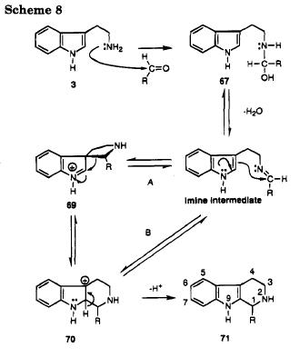 "The Pictet-Spengler reaction has generally been thought to proceed via a spiroindolenine intermediate as shown in Scheme 8 (path A), although Casnatiso has shown that cyclization can occur by direct attack at position 2 of the indole (path B) when very reactive electrophiles are employed."