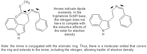 Therefore, the more the dipole moment is shifted toward the nitrogen, the more susceptible the carbon is to nucleophilic attack. The pKas of the imines are an indirect measure of electrophilic nature of the end of the imine containing the carbon. A Lewis acid is an electron acceptor; since the tryptophan methyl ester Schiff base has the lower pKa, it is more acidic and draws electron density away from the carbon, increasing its susceptibility to nucleophilic attack relative the the tryptamine Schiff base.