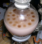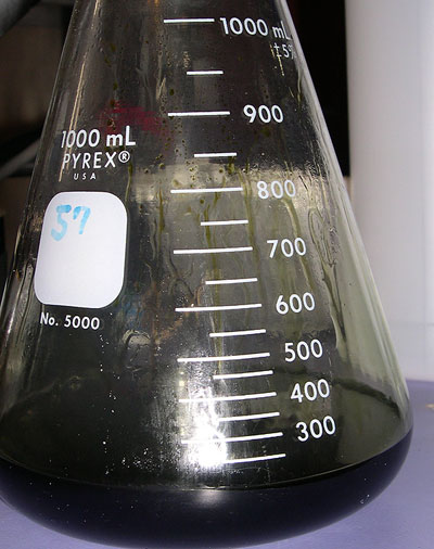 <whole bunch of stuff shouldn't have had to do because of inexperienced chemist> Eventually added 80 ml more GAA to get enough to stir, 20 more g NaBr, and 10 ml more sulfuric acid. Filtered off undisolved NaBr (wet cotton rags soaked in water and Bicarb helped keep the fumes under control while dismantling the space alien rig) Had 150 ml tangerine orange solution. Added 15 ml brazillian sassafras oil - instant color - darkish brownish green formed swirls on the top of the orange. In a few minutes it was all very dark green as shown in the pic. Currently in 1 liter flask wrapped in foil. Added another 16 ml for total of 31 ml sassafras - color very dark green and syrupy consistency. More pictures will be taken at 12 hours and 24 hours to monitor the progression.