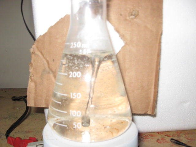 Homemade stir bar: I connected three or four of the neodymium magnets together to make the stir bar. To make it acid resistant I put them inside a piece of a bic pen that I cut to the appropriate length, and then sealed it to make it air tight.