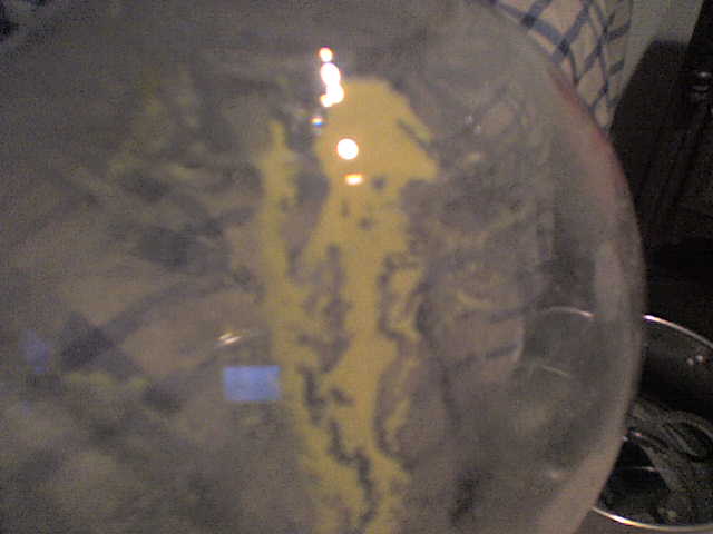 Since most sulfate salts, especially mercury ones, are very soluable in water, SLOWLY add enough hot(not boiling! slightly volitile!) dH2O into the flask to dissolve all the HgSO4. This was the first time I got a big wiff of H2SO4...wow, I'm not going to forget that scent anytime soon. If you're using 5g Hg metal to start with, then use ~200ml hot dH2O. Swirl the whole mix for a bit to make sure everything is dissolved and let settle. You should now see a yellow-ish precipitate on the bottom, which is trashy sulfate decomp. salt. Don't worry about it. The water also now contains H2SO4 in it again from the decomposition of HgSO4 in the water, and also Hg+2 ions.