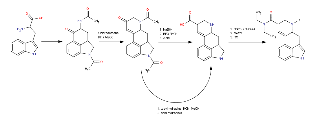 Looks like I have some bad news. After reviewing the literature on the second step (the one I was curious about earlier) it appears that using L-tryptophan will have the wrong chirality (of the Hydrogen). Instead of +(iso?)LSD you will get -(iso?)LSD. Does that matter as far as pharmacology goes?