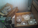 also is my box of seeds, some stupid Sorvall omni-mixer I need to sell sometime, and a styrofoam incubator. Also -- a wooden test tube holder, I am considering making those wooden test tube holders and selling them. Are they useful, or just some joke? I don't know if i could sell many for 10 or so a piece - and I'm not even sure it would be worth it.