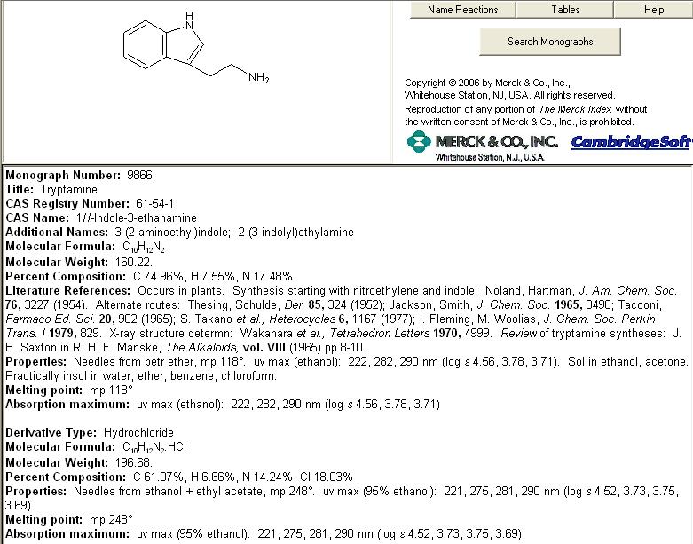 Yes the merck is odd! They say recrystallize from pet ether? You would need an awful lot of boiling pet ether to dissolve a very minute amount of tryptamine, although the resulting crystals are snow white. I triied, the volumes involved get ridiculous. Instead I use pet ether to crash tryptamine out of solution.