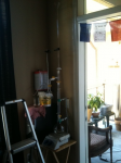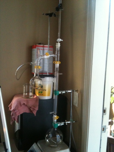 Edit: My addition funnel is a 50ml buret that I need a ladder to get to the top of so I can top it off when it runs low. Also you can see all the odd pieces I stuck on to attach a vent line to vent the carbon monoxide outside with.