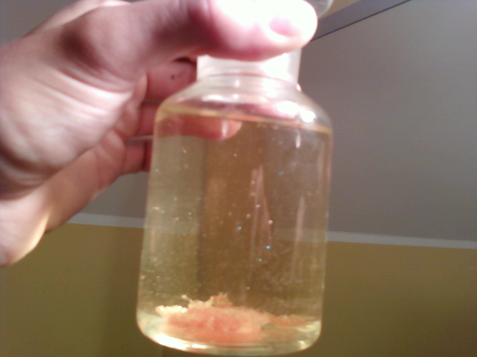 In the morning, 100ml of water was added to that oily residue which at first looked like a bit darkened, unreacted propiophenone. An oily bubble that sank to the bottom looked like nothing reacted at all. Disappointed I got dressed and went outside. After about 4 or 5 hours I came back to clean up, and dispose of the "failed experiment", but on my surprise, the oily mass at the bottom of the solution became needle-like crystals of orange-ish color sticked together as a single mass. Some sparkling crystals were also floating around in solution. And there were still some unreacted propiophenone.