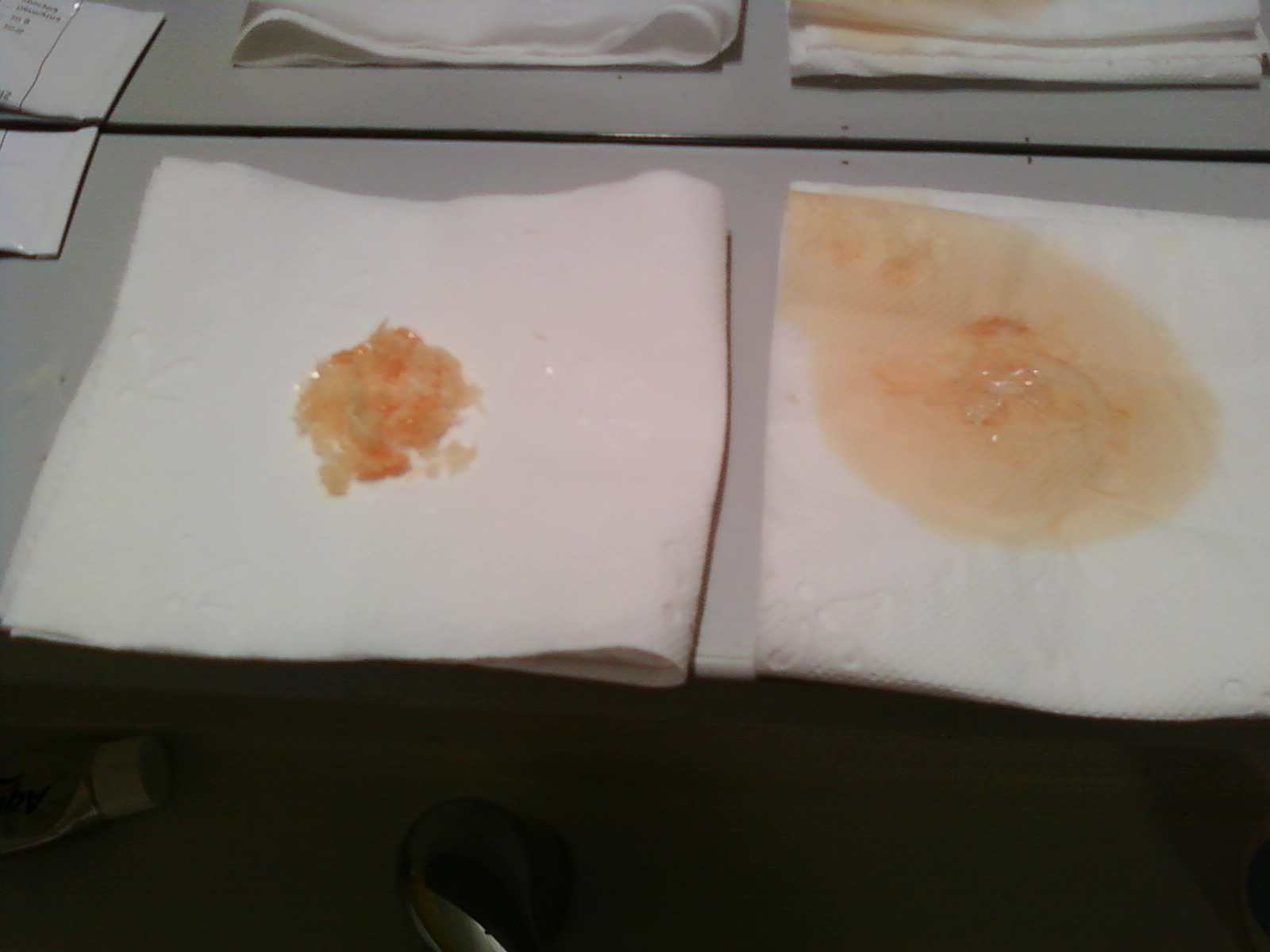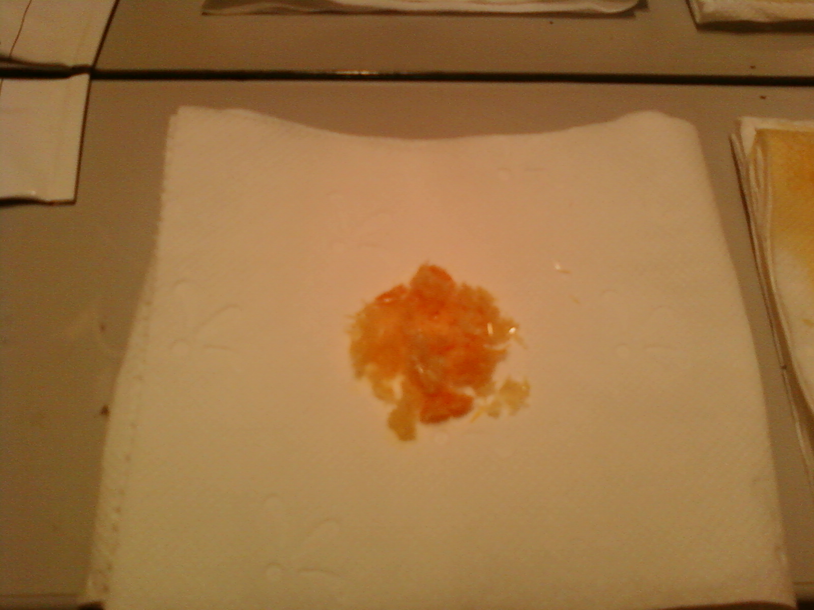 Water was poured off and crystals were placed on a toilet paper, to absorb the remaining water and unreacted propiophenone. They were then placed on a second peace of toilet paper, paper was then folded in half, and pressed hard to absorb remaining liquids.