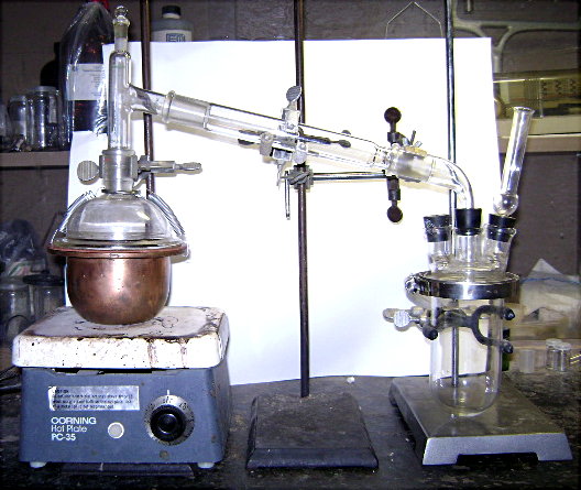 Swim tried heating a mixture of NaCl, CaCl and aluminum sulfate (dried by heating) according to US patent 1818839, but found that the temperature was so high to melt it that he abandoned it. Later, he tried heating some anhydrous zinc chloride in an evaporating dish on a hot plate and found that it could be melted fairly easily. The next step is to try heating a mixture of zinc chloride and aluminum sulfate to make anhydrous aluminum chloride which sublimes at about 180 degrees C (http://www.aluminumchloride.net/) and can be distilled off. A hybrid retort was constructed as shown in the picture. The distilling flask has a copper bottom, rubber gasket and the rest of the apparatus is glass so the distillate can be seen. If it condenses in the tubing, it could be heated to help it pass into the receiver (3 neck reaction flask) or can be scraped out of the tubing after cooling the apparatus. Also see US patent 1541068. One possible problem is the zinc chloride reacting with the copper. As long as it doesn't corrode all the way through, it shouldn't be a problem. Can the copper be coated with something to protect it? How about high temperature paint?