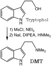 of course there are other ways to process tryptophol, PBr3 will give bromoethyl-indole. this will react with dialkylamine at RT over several days (or weeks?). but tosylation or mesylation is less messy, higher yielding, and the intermediate is (from what i read) 100x or 1000x as reactive toward dialkyamines as bromo-ethyl-indole is. the pharmaceutical companies mesylate in the patent for Sumatriptan.
