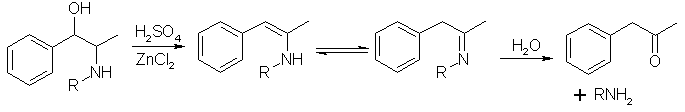 When ephedrine and related compounds are heated in strong aqueous acid, they are dehydrated to the enamine, which spontaneously can rearrange to the isomeric imine (Schiff Base), which then can be hydrolyzed into phenyl-2-propanone and an amine salt. As all the steps are reversible processes, the reaction equilibrium is driven towards the desired product by continuously removing the formed phenyl-2-propanone by the aid of steam distillation.