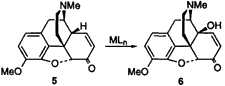 The oxidation of 5 to 6 can be accomplished by a variety of 2-step procedures via formation of a diene system followed by oxidation.13,14 Obviously, a direct procedure would offer the advantages of less synthetic steps and remove the necessity for the isolation of a diene intermediate. Previous attempts at such a direct oxidation have met with limited success due to competing oxidation at other positions on the opioid skeleton.14,15 The only direct method resulting in a reasonable yield involves the use of MnO2;16 treatment of codeine with MnO2 leads to codeinone, however prolonged treatment gives 6 in 30% yield. Although this procedure was subsequently improved using a 3-silyl ether derivative (59%)17, the large quantities of MnO2 employed limits its practicality for industrial scales. In an attempt to develop a practical method for this transformation, we investigated the treatment of 5 with a variety of readily available and easily handled oxidizing agents, with the ultimate aim of discovering a procedure that could be conveniently performed on commercial scales.