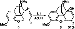 Initial studies concentrated on the fact that in acidic media, codeinone (5) exists in equilibrium with neopinone (7).18 It was envisaged that the different electronic character of the C-ring double bonds in 5 and 7 may allow selective oxidation of 7 with peracids, whereas the electron deficient double bond in 5 would not undergo oxidation. It was found that treatment of an equilibrium mixture of 5 and 7 under the performic acid conditions described by Iijima et al. for thebaine,10 led to low yields of 6 (Table 1, entry 1).