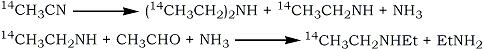 The method used by Stoll et al.1 for the synthesis of 14C1 -diethylamine involved catalytic hydrogenation of 14C-acetonitrile to give a mixture of diethylamine and ethylamine. The two amines were separated by counter-current distribution and the yield of 14C1-diethylamine was increased by reacting the ethylamine with ammonia and acetaldehyde.