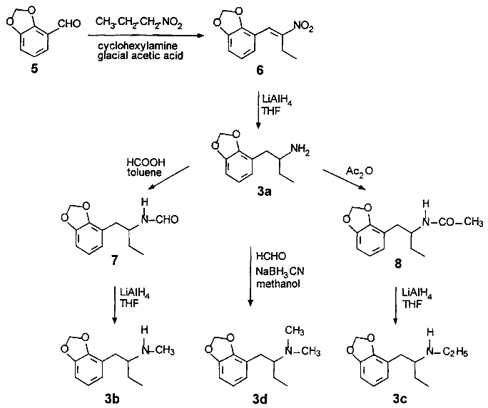 ß-ethyl-2,3-methylenedioxy-ß-nitrostyrene (6) 2,3-Methylenedioxybenzaldehyde (5) (3.0 g, 22 mmol), nitropropane (3.0 g, 34 mmol) and cyclohexylamine (2.2 g, 22 mmol) were dissolved in 20 ml of glacial acetic acid and heated to 95°C. After 6 h, the hot, yellow-brown solution was poured on crushed ice, stirred and acidified with concentrated HCl, whereby the crude product precipitated. Recrystallization from isopropanol provided 2.3 g (47% yield) of the nitrostyrene as bright yellow crystals. mp: 62°C. 1-(2,3-methylenedioxyphenyl)-2-butanamine hydrochloride (3a.HCl) A solution of 2,3-methylenedioxy-ß-ethyl-ß-nitrostyrene (3.7 g, 17 mmol) in 20 ml of THF was added for 30 min to a solution of LiAlH4 (4.2 g, 110 mmol) in 50 ml of THF and then heated to reflux. After 5 h, the excess LiAlH4 was quenched with dropwise water and the precipitated inorganic salts were removed via suction filtration. The filtrate was evaporated in vacuo to a yellow oil which was treated with etheral HCl and white crystals precipitated to give 2.8 g (85% yield) of 3a.HCl. mp: 168°C. N-formyl-1-(2,3-methylenedioxyphenyl)-2-butanamine (7) A solution of 3a (2.24 g, 12 mmol) and 1.0 ml of formic acid 98% (1.0 g, 22 mmol) were added to 100 ml of toluene and heated to reflux with a soxhlet containing 4 Å molecular sieve. After 48 h the resulting solution was evaporated in vacuo to give a colored oil, which was dissolved in 100 ml of dichloromethane and washed several times with diluted HCl. The organic layer was dried over anhydrous sodium sulfate and evaporated in vacuo to give 2.1 g (82% yield) of N-formyl-1-(2,3-methylenedioxyphenyl)-2-butanamine as a yellow oil. N-methyl-1-(2,3-methylenedioxyphenyl)-2-butanamine hydrochloride (3b.HCl) A solution of 7 (2.0 g, 9 mmol) in 10 ml of THF was added over 15 min to 60 ml of a solution of 2.28 g LiAlH4 in THF and heated to reflux. After 4.5 h the excess LiAlH4 was quenched dropwise with water in the usual manner. The oil was dissolved in dilute HCl and washed with dichloromethane, alkalized with concentrated NaOH and then extracted with dichloromethane. The combined organic layers were dried over anhydrous sodium sulfate and evaporated in vacuo to a light yellow oil, which was diluted with etheral HCl to give 0.8 g (41% yield) 3b.HCl mp 139°C. N-ethyl-1-(2,3-methylenedioxyphenyl)-2-butanamine perchlorate (3c.HClO4) A solution of 8 (1.0 g, 4.3 mmol) in 10 ml of THF was added for 5 min to a solution of LiAlH4 (0.6 g,15.8 mmol) in 20 ml of THF and heated to reflux. After 3.5 h the excess LiAlH4 was quenched in the usual manner. The extracted oil was evaporated in vacuo to a light yellow oil, which was dissolved in a solution of isopropanol, concentrated perchloric acid and diethyl ether (3:1:20) to get a spontaneous crystallization of 0.5 g (53% yield) 3c.HClO4. mp: 126°C. N-acetyl-1-(2,3-methylenedioxyphenyl)-2-butanamine (8) A solution of 3a (1.0 g, 5.2 mmol) in 2 ml of acetic anhydride (1.16 g, 11 mmol) was heated in a 10 ml glass tube to 75°C with continuous stirring. After 24 h the cooled mixture was dissolved in 30 ml of dichloromethane, washed several times with dilute HCl, dilute NaOH, water and then dried over anhydrous sodium sulfate. Evaporation under vacuum afforded 1.0 g (82% yield) of N-acetyl-1-(2,3-methylene-dioxyphenyl)-2-butanamine as an amber solid. mp: 93°C. N,N-dimethyl-1-(2,3-methylenedioxyphenyl)-2-butanamine perchlorate (3d.HClO4) A solution of 3a (l.2 g, 6.2 mmol) and 6.12 ml of 35% formaldehyde (6.67 g, 60 mmol) in 30 ml of methanol was stirred at room temperature. Sodium cyanoborohydride (2.5 g, 40 mmol) was added, the reaction mixture was maintained at pH 6 by adding concentrated HCl dropwise and then heated to reflux for 48 h. The mixture was suspended with water, acidified with dilute HCl and washed with dichloromethane, then alkalized with concentrated NaOH and extracted with dichloromethane. The combined extracts were dried over anhydrous sodium sulfate and evaporated in vacuo to a light yellow oil, which was dissolved in a solution of isopropanol, concentrated perchloric acid and diethyl ether to get a spontaneous crystallization of 0.1 g (5% yield) 3d.HClO4. mp:101°C. References [1] T.A. Dal Cason, MDA Analogs and Homologs, Forensic Sci. Int. 35, 675 (1990)