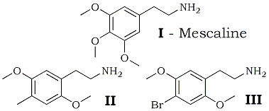 4-Methyl-2,5-dimethoxyphenethylamine (II) was prepared by the chemical interaction of 2,5-dimethoxy-4-methylbenzaldehyde and nitromethane, followed by the reduction of the resulting nitrostyrene by LiAlH4. It is isolated as the hydrochloride salt, a white solid with melting point 211-212°C after recrystallization from ethanol (lit.8 mp 212-213°C). 4-Bromo-2,5-dimethoxyphenethylamine (III) was obtained from 2,5-dimethoxyphenethylamine by elemental bromination in acetic acid as has been described for the corresponding phenylisopropylamine7. This product was also obtained as the hydrochloride salt with a residual pale pink color which persisted despite recrystallization from ethanol. This can be removed by heating the free base in 25% NaOH. The melting point of the hydrochloride salt is 237-239°C, with decomposition.