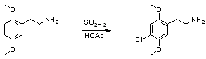 2,5-Dimethoxyphenylethylamine (1.81g, 10 mmol) was dissolved in 20ml glacial acetic acid in a 50ml beaker equipped with magnetic stirring and a thermometer, and placed in an ice-bath. Sulfuryl chloride (2.0g, 1.20ml, 15 mmol) was added dropwise2 to the solution over 30 minutes, the whole time keeping the temperature of the solution between 15-20°C3. When the addition was finished, the ice-bath was removed, and the solution allowed to warm up to room temperature (25°C) and stirred for another 90 minutes, the temperature being monitored occasionally so that it didn't exceed 30°C. A too high reaction temperature causes partial dichlorination of the substrate, a temperature of 40°C during the addition invariably causes side reactions.