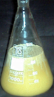 The oil was dissolved under stirring in 300mL GAA, and the flask placed in an ice-H2O bath. A solution of 53.3mL [166.2g; 1.04mol] Br2 in 300mL GAA was added under stirring in one portion, and a reflux column was quickly attached. After ~1min the flask was removed from the ice-H2O bath and the rxn mixture left to stir at room temp. The flask became warm, and after approx. 6min spontaneously crystallised to a pale yellow-orange unstirrable mass [Fig. 2 (left)].