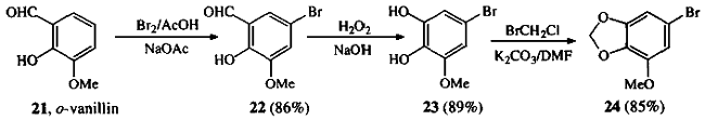 Treatment of o-vanillin 21 with bromine in a mixture of sodium acetate and glacial acetic acid gave 5-Bromo-3-methoxysalicylaldehyde 221, which was subjected to Dakin oxidation conditions to give 3,4-Dihydroxy-5-methoxybromobenzene 232. Methylenation of 23 gave the known 3,4-Methylenedioxy-5-methoxybromobenzene 243.