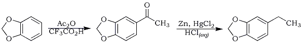 This was performed through Clemmensen reduction of 5-acetyl-1,3-benzodioxole, using the amalgamated zinc recovered from the reduction of piperonal. A similar procedure was also employed using 5 g of 3,4-methylenedioxyacetone and adjusting the amounts of reagents used. The distillation under reduced pressure yielded 2 g, 44%, of colorless 5-ethyl-1,3-benzodioxole, bp 82°C/25mmHg.