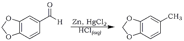 A 1000 mL round-bottomed flask immersed in an efficient cooling system was charged with 20 g of mossy zinc, 12 g of mercuric chloride, 200 mL of water and 6 mL of concentrated hydrochloric acid. An exotherm was detected when shaking the mixture for 5 min. After decanting the liquid layer, 100 mL of benzene and 50 g of piperonal were carefully added to the amalgamated zinc remaining in the flask. The flask was immersed in a heating mantle and the mixture was vigorously refluxed for 24 hr. After cooling the mixture to 25°C and separating the benzene layer, the aqueous layer was extracted with two 75 ml, aliquots of ether. The benzene and the etherate extracts were combined and dried over anhydrous calcium chloride for 24 hr. The solvents were evaporated under reduced pressure. The residue was distilled to yield 14.4 g, 32%, of 5-methyl-1,3-benzodioxole, 85°C/26 mmHg.