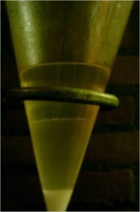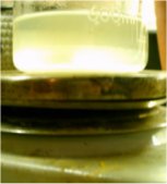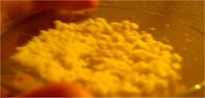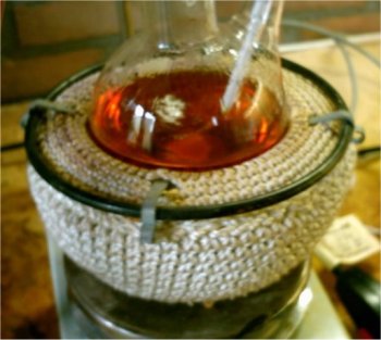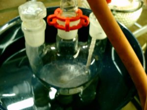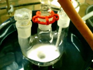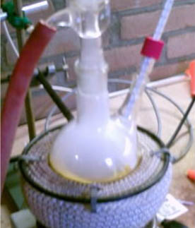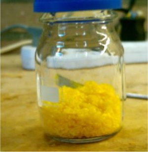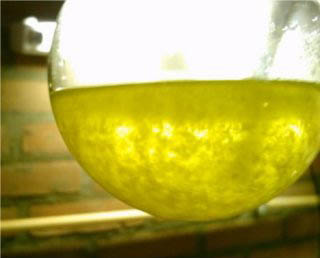 When the solution had cooled down to to 60°C it was decanted into a beaker for quicker cooling this left a lot of smoke in the RBF, after adding some H2O to the RBF the smoke cleared up and caused formation of some residue yellow crystals.