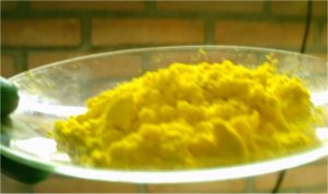 With good stirring the now 20°C decanted solution was diluted slowly using 325 mL H2O, this caused the formation of a thick yellow crystalline mass.