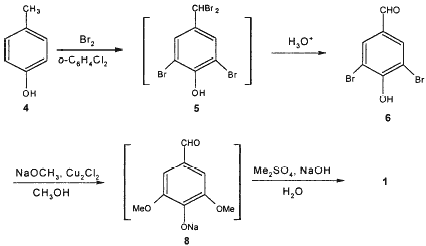 However, low yield (60%) of 3,5-dibromo-4-hydroxybenzaldehyde 6, large amount consumption of solvent DMF due to its liability to thermolysis in the presence of CH3ONa during the methoxylation of 6, the use of the solvent acetone and long reaction time (18 h) in the methylation of 7 restrict its application as an efficient industrial process. Therefore, a more economical, convenient and environment-friendly synthesis of 1 is needed.