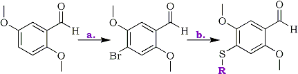 4-Bromo-2,5-dimethoxybenzaldehyde (18.1g, 74 mmol) was dissolved in DMF (185 ml) and was stirred 48 hours with powdered K2CO3 (10.2g, 74 mmol) and the respective thiol (148 mmol). The reaction mixture was poured onto water and ice (2 L) with good stirring and the precipitated solid was filtered, washed with water and dried, and then recrystallized in MeOH or in MeOH-water. Yields and mp of these products are in Table 1.
