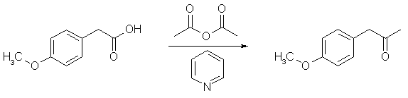 Synthesis of p-Methoxyphenylacetoneby Psycho ChemistProcedureIn a 1000 mL flask with double surface condenser/drierite tube, reflux 600 mL acetic anhydride, 100 mL pyridine (dry) and 100 g 4-methoxyphenylacetic acid for 18 hrs with good stirring. Thereafter, distill off 600 mL acetic acid, acetic anhydride and pyridine over a 30x500 mm helices packed column. The residue is added - when cooled down (!) - to 500 mL water, and stirred for 30 min. to hydrolyze any present acetic anhydride. The mixture is then extracted with 5x200 mL methyl tert-butyl ether, and the pooled extracts are washed with 4x100 mL 20% sodium hydroxide (keep the alkaline washings), and 200 mL saturated aqueous NaCl. The organic layer is dried over sodium sulfate, evaporated (rotary evaporator, recover the solvent), and the residue distilled to give 60 g p-methoxyphenylacetone, bp 145-165°C at about 20 mmHg. Recovery of unreacted 4-methoxyphenylacetic acidThe alkaline washings are pooled, acidified (pH 1) with hydrochloric acid, and extracted with 4x100 mL methyl tert-butyl ether. The pooled organic extracts are evaporated (rotary evaporator, recover solvent), and the residue is mixed with 100 mL toluene or benzene. The solution is refluxed with a Dean-Stark adapter/double surface condenser, to remove any present water, then the solvent is distilled off in vacuum to get 25g of unreacted p-methoxyphenylacetic acid. ![]() 4-Methoxy-Phenyl-2-Propanone4-Methoxy-Phenyl-2-Nitropropene (10 g, 51 mmol) was dissolved in 75 ml HOAc and slowly dripped into a refluxing slurry of Fe powder (32 g, 0.57 mol) in 140 ml HOAc. The mixture first turned brownish, and then white and foamy, and the mixture was refluxed on low heat for 1.5 h. The reaction mixture was poured into 2000ml water, and was extracted with 3x100 ml CH2Cl2. The combined extracts was washed with 2x150 ml H2O and dried over MgSO4. The solvent was distilled off at atmospherical pressure, and the residue distilled under vacuum to give 6.1g (37 mmol, 72%) of an orange-pink oil at 110°C at 3mmHg. Reference: Shulgin & Shulgin, Pihkal, #109