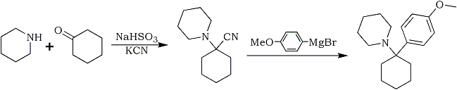 Warning: while the final compound is not scheduled, and therefore is legal, one of the intermediates (PCC) is a schedule II controlled substance in the USA. Thus proper licensing would be required to undertake this procedure. Note that replacement of pyrrolidine with piperidine in Step 1 of this synthesis would provide a final compound that would almost certainly be as potent as 4-methoxy-PCP, and would avoid the use of controlled PCC.