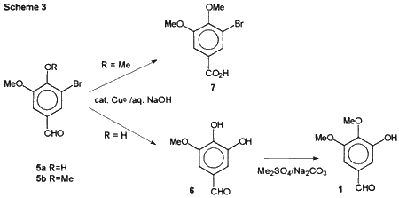 We have now developed a three step synthesis of 1 from vanillin shown in Scheme 3 which achieved these goals. The first intermediate was 5-bromovanillin (5a) which is commercially available or can be prepared by bromination of vanillin with bromine in acetic acid by the method of Dakin.5