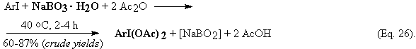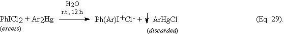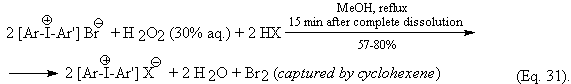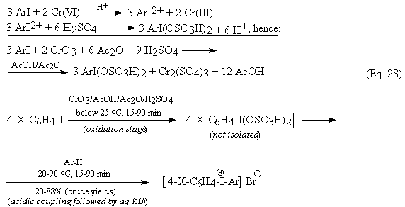 When benzene was iodinated according to Eq. 3, the yield of PhI was low (10%). However, from the collected aqueous layers we precipitated out a yellow solid with excess aq. KBr. After its recrystallization from MeOH is was identified as diphenyliodonium bromide (44%). We commented this as follows [8]: “This novel “one-pot” method of preparing the symmetric diaryliodonium salts is presently being improved and extended [70], and will be published soon”. However, there is a delay in publishing this method.