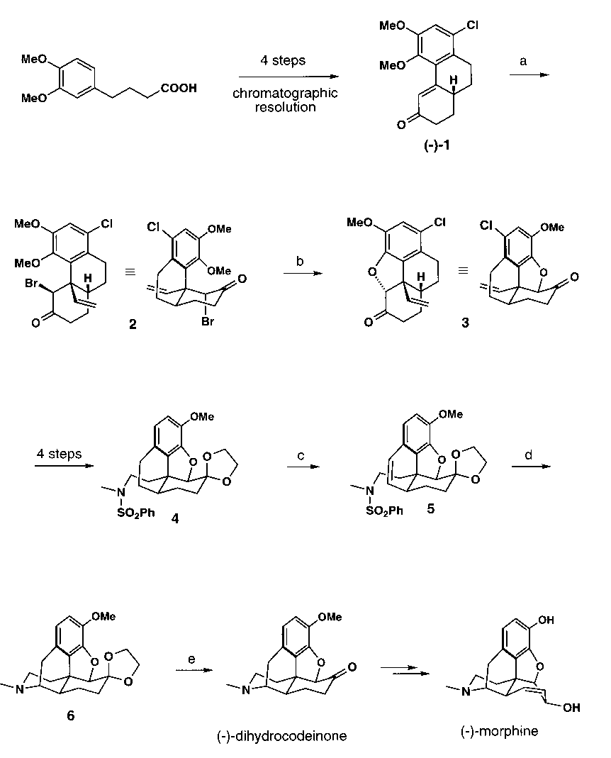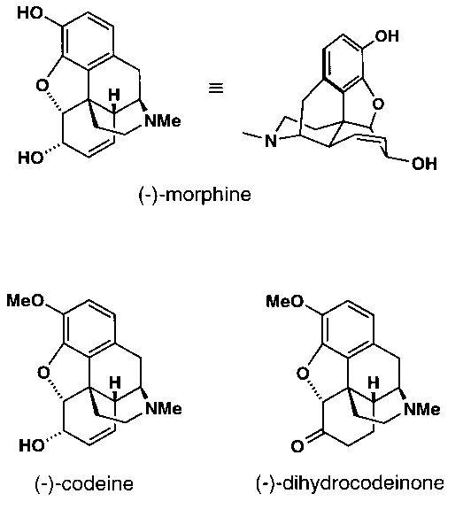 (-)-Morphine, the main alkaloid of the opium poppy, remains one of the most important medicines for the treatment of severe pain and a true delight for synthetic chemists.1 In spite of its small size and long history, it is still considered to be an interesting target for chemical synthesis. (-)-Morphine and its synthetic precursors (-)-codeine and (-)-dihydrocodeinone feature a complicated network of three carbocycles and two heterocycles containing five vicinal stereocenters, four of which define ring junctures. Among these, the benzylic quaternary carbon deserves special attention.