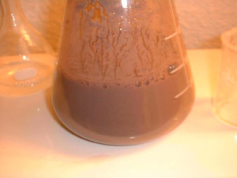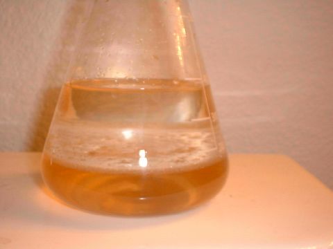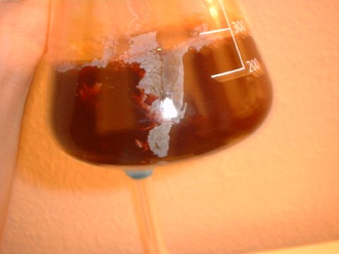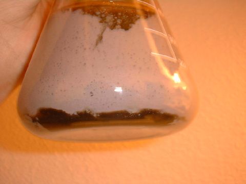 Something else which I have heard from others, which I have now verified, is the value of doing washes. Previously washing was little mentioned, and only the wash of the acidic extract was suggested (and again, a much longer than necessary time stated), when in fact the best results seem to be from doing a non polar wash of the acidic extract, and using a fairly low pH (like 8-9) and no salt, for washing the non polar extract (the best proceedure seems to be using sodium bicarbonate as it reacts with sodium hydroxide to produce sodium carbonate, which more readly comes free of the nonpolar fraction). Washes ensure the resulting product is as free from contaminants of a non-alkaloidal nature as possible, in particular residuals of the base being used. Again, gentle agitation is completely sufficient for extractions and washes, and in the case of water washes, violent agitation will not allieviate suspended droplets of the base, the bubbles of the wash water, being alkaline, will wash some out, but will also leave the suspended bubbles of base in the nonpolar solvent, though by this stage in the process it doesn't matter as much as it should be quite clean already.