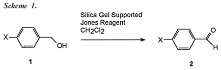 Oxidation of alcohols to carbonyl compounds is one of the most important reactions in organic chemistry. Chromium(VI) reagents are widely utilized in the oxidation of alcohols to carbonyl compounds. Jones reagent is the best known of these Cr(VI) reagents for oxidation of secondary alcohols to ketones. However, it fails to produce satisfactory results for oxidation of primary alcohols, including benzyl alcohols to the corresponding aldehydes1. Difficulty in the above oxidation reaction arises due to the fact that aldehydes react with water and alcohols under acidic aqueous media employed in the Jones oxidation procedure, producing hydrates and hemiacetals, which are then oxidized to carboxylic acids12, and esters3 respectively. A number of Cr(VI) based reagents or procedures have been developed to avoid these problems11-15. Most of these reported reagents are complexes of an amine and Cr(VI)oxide. Unfortunately, these procedures produce slow reactions5,8,9,11,14, and require meticulous and time-consuming preparative methods8,11,13. Recently, employment of solid supported chromium (VI) reagents in the oxidation of alcohols to carbonyl compounds has generated interest. In most cases, solid-supported reagents have been found superior to the non supported reagents. Solid supports modify activity of the reagent, improve selectivity, and, more importantly, make product isolation easier. There are some isolated reports on oxidation of benzyl alcohols to benzaldehydes with solid supported chromium(VI) reagents9,15-22. However, these solid supported chromium reagents require difficult and laborious preparation9,16,17,21, activation by subjecting the supported reagents to high temperature for prolonged periods of time20,21, have a longer reaction time20,21, produce low yields17,18, and require elevated temperature for the reaction to work15-17. Herein, we report a systematic study of the oxidation of benzyl alcohols to benzaldehydes with a new reagent prepared by supporting Jones reagent on silica gel (SJR). It is noteworthy that SJR does not suffer from many of the undesired properties associated with previously reported solid supported chromium reagents.