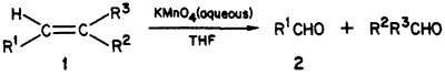 In a mechanistic study on 1,5-benzodiazepines, we needed compound R4CHO for identifying a reaction intermediate. Attempts at converting the 4-methyl of R4CH3 to a formyl group via oxidation or dihalogenation/hydrolysis were unsuccessful. We have found however that treatment of a dilute THF solution of 1 (with R1=R4, R2=H, and R3=Ph) by a concentrated aqueous solution of KMnO4 afforded the desired aldehyde R4CHO and benzaldehyde in 80% yield. The lack of extensive overoxidation is surprising since in the overwhelming majority of reported cases cleavage leads to the corresponding acids. The testing of this procedure on some other olefinic compounds indicates that it may be useful in the synthesis of a variety of aldehydes. Examples are listed in Table I. Apparently, activation of the double bond by conjugation increases, whereas adjacent bulky groups decrease the yield.
