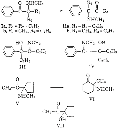 We wish to report the discovery of a novel skeletal rearrangement of α-aminoketones. An example of this rearrangement is the conversion of 2-ethyl-2-methylaminobutyrophenone (Ia) to 3-methylamino-3-phenyl-4-hexanone (IIa) in 35% yield at 240°C. Similarly, Ib could be rearranged to IIb in 32% yield. The scope of the reaction was shown to include aliphatic aminoketones by the 32% conversion of a-methylaminocyclopentyl methyl ketone (V) to 2-methyl-2-methylamino-cyclohexanone (VI), which rearrangement involved ring enlargement.