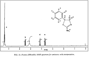 The obtained spectrum is indicative of the assigned structure of aminorex, with the phenyl group appearing at 7.35 δ, a benzylic methine triplet at 5.46 δ, the exchangeable amino group at 5.2 δ, and the nonequivalent hydrogens of the methylene group β to the phenyl ring at 4.13 and 3.65δ. The 13C NMR spectrum is equally supportive of the 4,5-dihydro-5-phenyl-2-oxazolamine structure, with no upfield methyl signal and with the remaining carbon absorbances occurring at their expected 8 values (Fig. 3). Decoupling analysis of this spectrum indicates quaternary and secondary carbons at 160.89 δ, 140.62 δ, and 60.63 δ, corresponding to the imine carbon (C-2), the phenyl carbon attached to C-5, and the methylene carbons (C-4). The remaining methine carbons manifested signals at 128.62 δ, 128.14 δ, 125.66 δ, corresponding to the phenyl carbons, and at 81.43 δ, which was assigned as the C-5 absorbance.