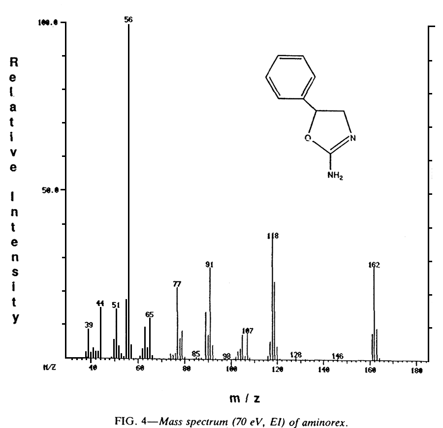 Mass spectrometric analysis was performed on the sample in question by probe distillation introduction. This technique indicated the presence of impurities which vaporized at higher temperatures than did the object compound. An EI spectrum of the material is given in Fig. 4. The fragmentation pattern and the molecular ion are indicative of the aminorex structure and compare well with those of standard spectra12. The M+ peak is 162 m/z. Loss of the carboxamide group CONH2 produces the fragment at 118 m/z, while generation of protonated benzyl alcohol results in the m/z = 107 fragment. Other important fragments include the tropylium ion (91 m/z) and the phenyl cation at 77 m/z. The base peak of the spectra (56 m/z) appears to be due to the imine structure, NH2-C=N-CH2+. The mass spectrum reported for methylaminorex is characterized by an M+ of 176 m/z and a base peak of 70 m/z, each differing by 14 mass units from the corresponding aminorex fragments. The collected analytical information leaves little doubt that the compound in question was the desmethyl derivative, aminorex, of the controlled substance methylaminorex.