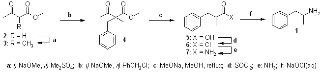 Amphetamine (1) can be synthesized by the sequential alkylation of methyl acetoacetate (2) with dimethyl sulfate and benzyl chloride, followed by hydrolysis and deacetylation to give 2-phenylpropionic acid (5), which through reaction with thionyl chloride and ammonia forms 2-phenylpropionamide (7). Upon treatment with aqueous sodium hypochlorite, this amide undergoes Hofmann rearrangement to form racemic amphetamine (phenyl-2-aminopropane).
