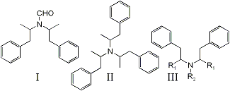 The synthesis of amphetamine by the Leuckart synthesis requires the reaction of methyl benzyl ketone with either formamide or ammonium formate, producing N-formylamphetamine as an intermediate1,2. It is believed that Structure I is produced by reaction between N-formylamphetamine and excess ketone. Its presence in DL-amphetamine, therefore, should provide strong evidence for the implication of the Leuckart synthesis in the manufacturing process.