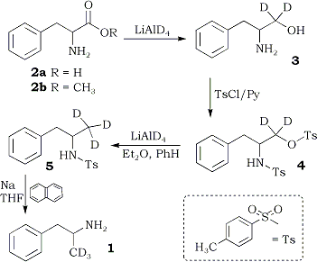The major advantages of the above synthetic route are the use of commercially available resolved phenylalanine as starting material, and the use of a convenient source of deuterium, lithium aluminum deuteride.